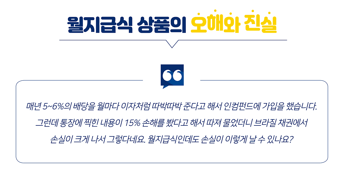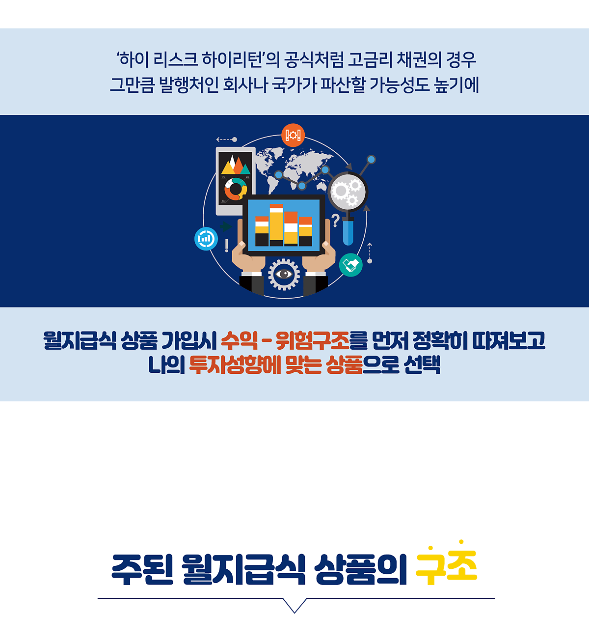 가끔 투자자들과 상담을 하다가 종종 듣는 질문 중 하나이다. 월지급식 상품이라는 명칭이 자칫 안전을 담보하는 듯한 착각을 줄 수 있기 때문인데 사실 이는 오해이며 중요한 건 돈을 가입한 상품의 수익-위험 구조에 의해 안전성 또한 좌우된다.