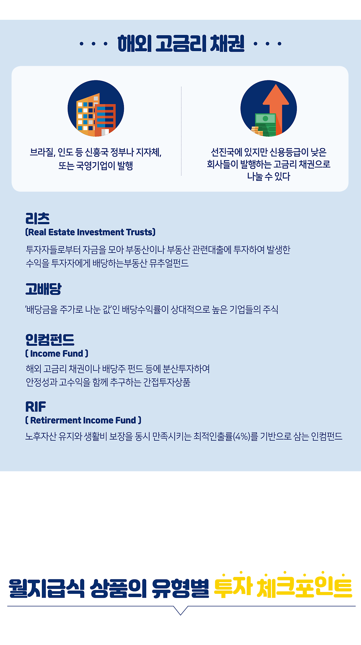 이들 중 대다수는 투기등급(투자 부적격) 수준의 낮은 신용등급을 가진다. 고배당주와 리츠(Real Estate Investment Trusts, 부동산투자신탁)는 상대적으로 높은 수익을 낼수 있는 월지급식 금융상품으로 각광받고 있다. 리츠는 투자자들로부터 자금을 모아 부동산이나 부동산 관련대출에 투자하여 발생한 수익을 투자자에게 배당하는부동산 뮤추얼펀드이다. 고배당주란 ‘배당금을 주가로 나눈 값’인 배당수익률이 상대적으로 높은 기업들의 주식을 말한다.