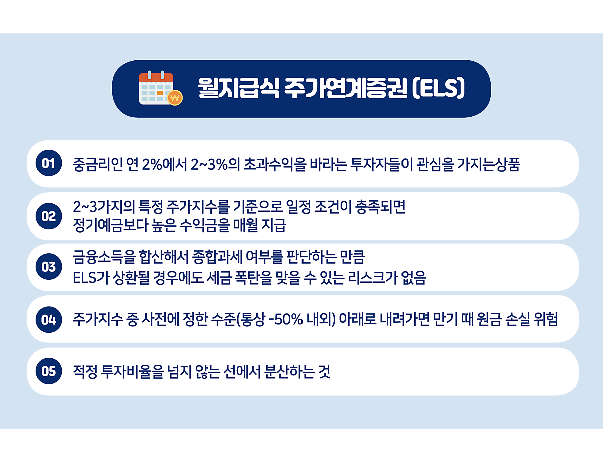 현재 시중금리인 연 2%에서 2~3%의 초과수익을 바라는 투자자들이 관심을 가지는 상품으로는 월지급식 주가연계증권(ELS)이 있다. 이 상품이 만기에 한꺼번에 수익금을 지급하는 ELS와 가장 다른 점은, 2~3가지의 특정 주가지수를 기준으로 일정 조건이 충족되면 정기예금보다 높은 수익금을 매월 지급해 준다는 것이다.