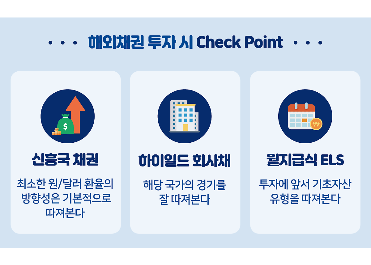 해외채권 투자시 신흥국 채권의 경우 환율 변동에 따른 손실 폭이 크게 차이 날 수 있으므로 최소한 원/달러 환율의 방향성은 기본적으로 따져보아야 한다. 만약 원/달러 환율이 하락할 경우 그만큼 수익률도 하락하기 때문에 달러약세-원화강세구간에서는 환헤지(Foreign Exchange Hedge)형 상품을 선택하는 것이 좋다.