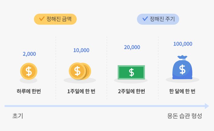 아이가 유치원에 다니거나 초등학교에 입학할 즈음이면 본격적인 용돈 교육을 시작하는 것이 좋습니다. 이때 중요한 것은 용돈 주기와 금액, 사용처 등 기준에 대해 부모 일관성을 가져야 한다는 것입니다. 용돈 액수는 정해진 주기에 따라 미리 약속한 금액만 지급하고, 용돈 주기는 처음엔 하루 단위로 시작하되, 이후 아이가 익숙해지면 일주일에 한 번, 2주에 한 번, 한 달에 한 번 등으로 넓혀갑니다.