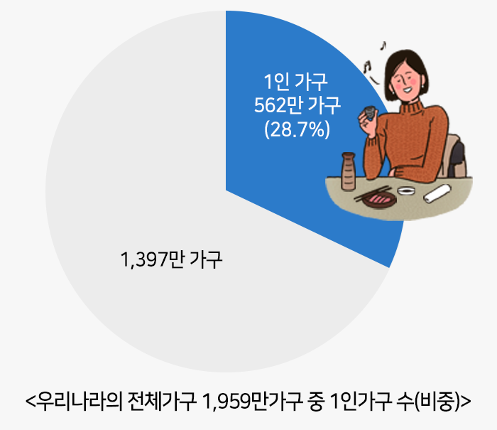 2018년 9월 통계청 자료(2017년 기준)에 따르면 우리나라 전체 가구(1,959만 가구) 중 1인 가구는 약 562만 가구로 28.7%를 차지하고 있다고 한다.