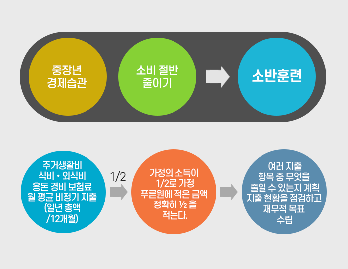 소반훈련을 통해 줄일 수 있는 지출 항목이 나왔다면 명확한 지출 현황을 점검하고 재무적인 목표를 정해야 노후에 대한 막연한 불안감도 덜어지고 부부간의 갈등과 긴장관계가 풀릴 수 있습니다.