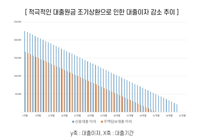 원금을 함께 상환하게 될 경우 4년 동안 이자는 425만 원으로 375만 원이 절감됩니다. 굳이 은행 창구에 가지 않더라도 인터넷뱅킹을 이용해 조기 상환하면 됩니다. 임금피크제가 시행되기 전까지 신용대출 상환에 집중해야 마음이 홀가분할 것입니다.