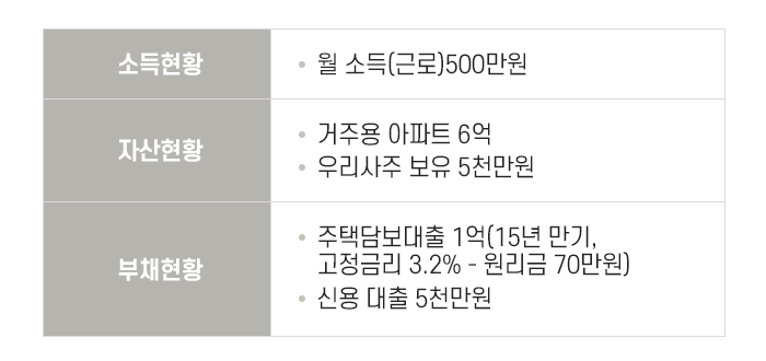 6억 상당의 아파트는 있지만 빚이 1억 원 남아있습니다. 직장에서 우리사주를 매입하기 위해서 신용대출을 받은 5천만 원이 있습니다.