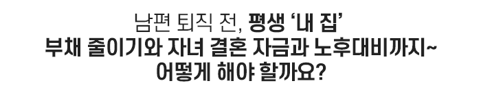 노후준비도 마땅히 해 놓은 게 없어 집에 대한 부채라도 줄여야겠다는 생각에 남편은 빚을 갚고 싶어 하지만 아내는 자녀들 결혼자금을 모아 놓자는 생각입니다.