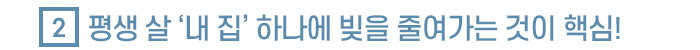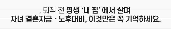 빚 없이 평생 살 내 집 하나 있는 것은 좋은 일입니다. 향후 70세 전후 본격적인 노령기가 다가오면 그때 ‘빚 없는 내 집’ 은 주택연금을 통해 풍성한 노후생활비의 바탕이 될 것입니다.