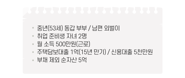 취업 준비생 자녀 2명을 둔 53세 동갑내기 부부입니다. 자녀 두 명이 대학 다닐 때까지는 맞벌이를 하다가 현재는 외벌이로 남편 소득은 월 500만 원입니다.