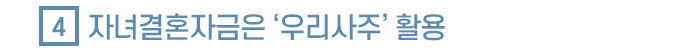 자녀 결혼 시기가 다가오면 보유 중인 우리사주를 적절한 시점에 자녀결혼자금으로 활용하는 것이 좋습니다. ‘우리 사주’ 만큼이나 귀한 것은 ‘우리 자녀’일 테니까요.