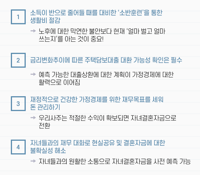 행복한 노후를 위해 부부가 협력하고 건강한 경제를 가꾸어가는 모습을 자녀에게 보여주는 것이 부모의 역할이기도 할 것입니다.