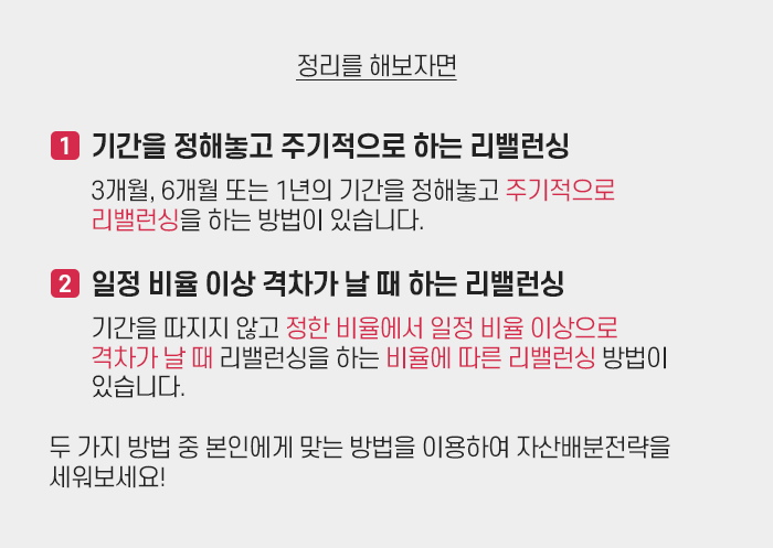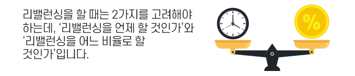 리밸런싱의 시기는 6개월에 한 번 혹은 1년에 한 번과 같이 일정한 기간을 정해놓고 하는 것을 추천합니다.