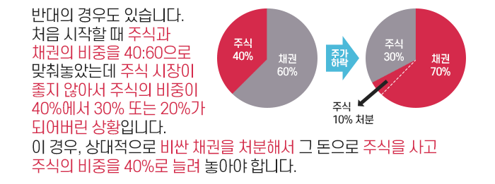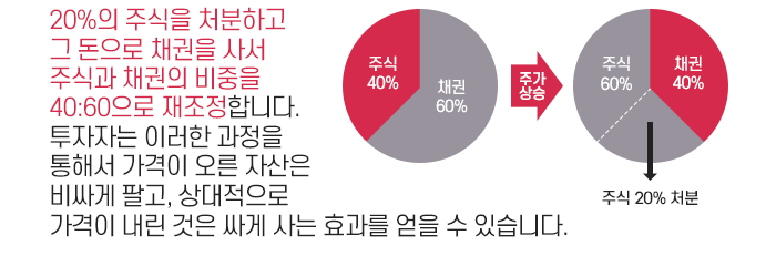 예를 들어, 주식과 채권의 비중을 40:60을 기준으로 자산을 배분하여 투자를 시작했는데 주가가 많이 올라서 주식의 비중이 40%에서 60%가 되고, 채권의 비중이 60%에서 40%가 되었다고 가정해보죠.