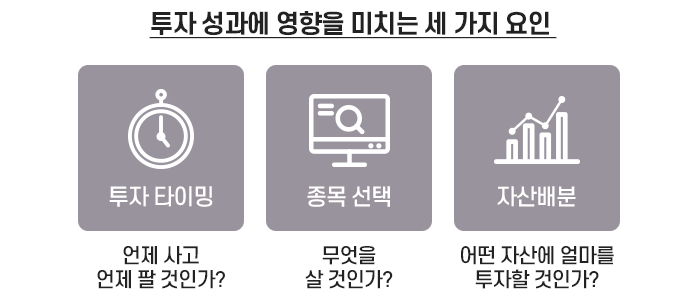 투자 타이밍이나 종목 선택이 단기적으로는 투자에 큰 영향을 미치지만 장기적으로는 전체 투자 성과에 미치는 영향이 10%가 안 됩니다.