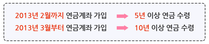 이때 연금수령 기간은 연금계좌 가입시기에 따라 다릅니다. 2013년 2월 이전에 가입한 사람은 5년 이상 연금으로 수령하면 되고, 그 이후에 가입한 사람은 10년 이상 연금으로 수령해야 합니다.