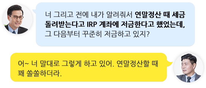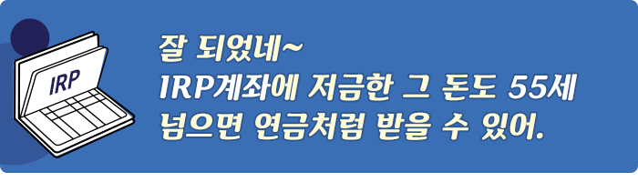 또한 퇴직금을 일시에 수령하면 퇴직소득세를 공제하지만, IRP로 이체하면 세금을 떼지 않습니다. IRP계좌로 이체한 퇴직급여는 55세 이후부터 연금으로 수령할 수 있는데, 이는 소득공백을 메울 수 있는 아주 좋은 방법입니다.