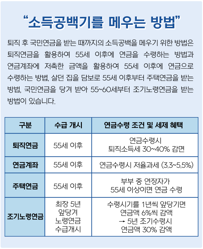국민연금 도입 당시만 해도 60세였던 노령연금 수급 개시 시기가 65세를 향해 늦춰지고 있습니다. 55세부터 65세 사이에 짧으면 5년, 길면 10년에 가까운 소득공백이 발생하는 셈입니다.