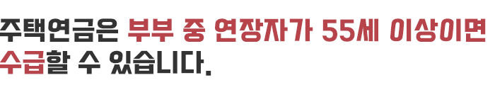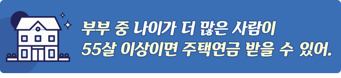 주택연금에 가입하려면 주택소유자가 55세가 넘어야 한다거나, 부부 모두 55세 이상 되어야 한다고 잘못 알고 있는 경우가 많지만, 주택연금은 주택이 누구 소유인지 상관없이 부부 중 연장자가 55세 이상이면 가입할 수 있습니다.