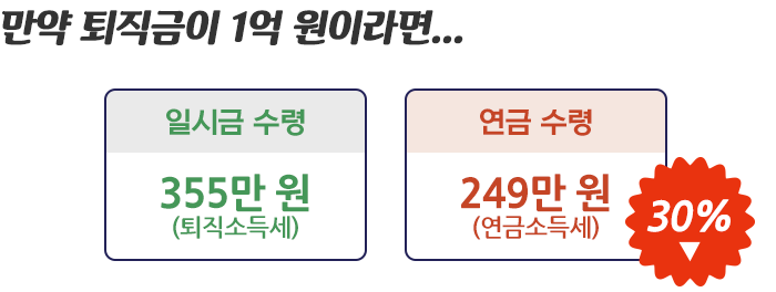 연금소득세율은 연금수령연차가 10년 차 미만일 때는 퇴직소득세율의 70%, 그 이후에는 60%입니다. 퇴직급여를 연금으로 수령하면 퇴직소득세를 30~40% 절감할 수 있는 셈입니다.
