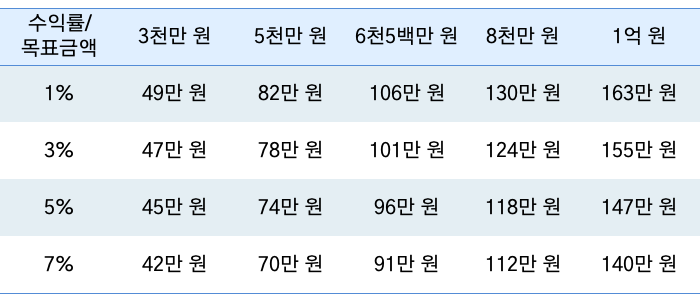 금리 1%로 운용할 수 있다면 106만 원, 3%로 운용할 수 있다면 101만 원, 5%로 운용할 수 있다면 96만 원, 운용수익률에 따라 필요 저축 금액을 가늠해 보고 필요한 금리 또는 수익률에 부합하는 재테크 상품을 선택할 수 있습니다.