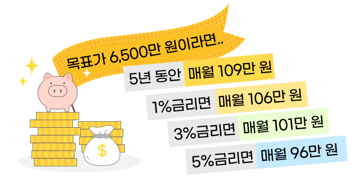 목표 달성을 위해 단순계산으로 5년 동안 매월 약 109만 원을 저축하면 모을 수 있습니다.