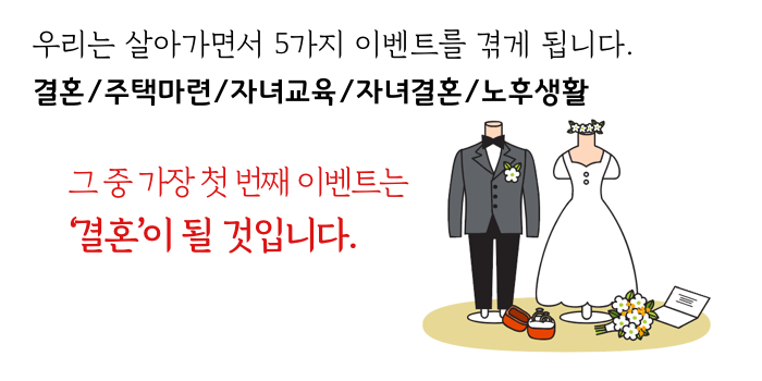 대부분의 20~30대가 최초로 맞닥뜨리게 되는 이벤트가 ‘결혼’일 것입니다. 결혼 준비가 최초의 재무 목표가 될 수 있다는 이야기입니다.