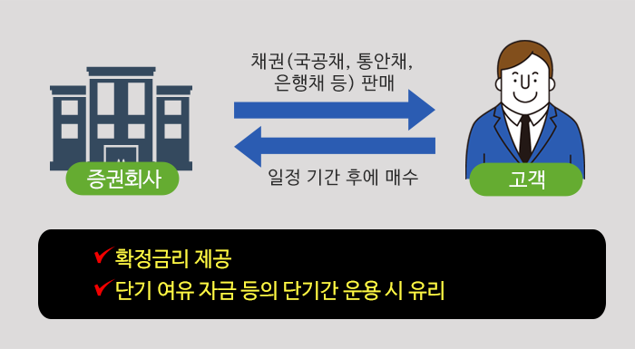 증권회사가 보유하고 있는 채권(국공채, 통안채, 은행채 등) 등을 일정 기간 후에 다시 매수하는 것을 조건으로 고객에게 판매하는 단기금융상품이며, 확정 금리를 제공하는 것이 가장 큰 특징이다.