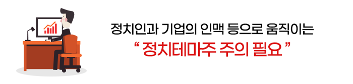 또한 해당 정치인과 기업의 인맥 등으로 움직이는 정치테마주의 경우는 더욱 주의가 필요합니다. 이런 부분이 실질적인 기업의 실적과 가치에 연결될 가능성이 없기 때문입니다. 소위 실체가 없는 테마주의 대표이기 때문에 시세만 쫓기에는 한계가 분명히 있습니다.