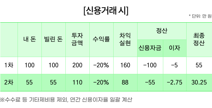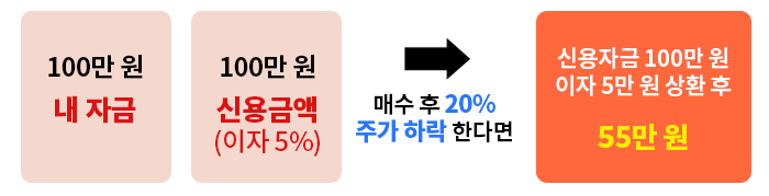 내 자금 100만 원과 신용금액(이자 5%로 가정) 100만 원을 더해 200만원으로 매수했다가 주가가 20% 하락해서 40만 원을 손해 보고 정리한다면(신용자금 100만 원, 이자 5만 원 상환) 원금은 55만 원이 남게 됩니다.