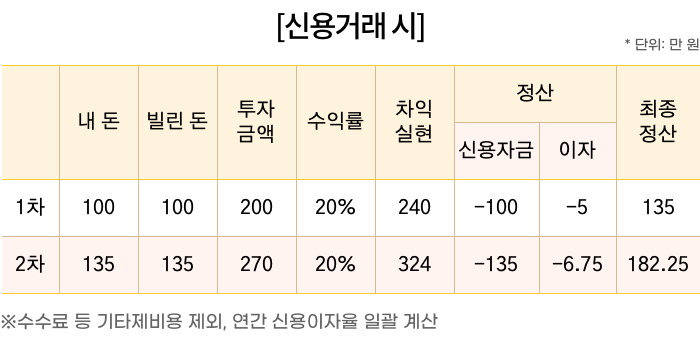 게다가 다시 신용금액을 추가하여 135만 원의 2배인 270만 원으로 매수를 해 또 20%의 수익을 보고 정리를 하게 되면 (신용자금 135만 원, 이자 6.75만 원 상환) 내 잔고는 약 182만 원이 됩니다.