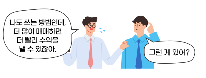“오~ 요즘 돈 버는 재미가 쏠쏠하다며? 이럴 때는 돈을 최대한 끌어모아서 수익률을 계속 올려야 하지 않겠어? 나도 쓰는 방법인데, 내 돈에 추가로 돈을 더 얹어서 매매하면 더 빨리 수익을 낼 수 있는 방법이지. 내 돈은 조금만 넣고 증권사에서 돈을 빌려서 하는 건데, 벌 수 있을 때 최대한 벌어 봐.”
