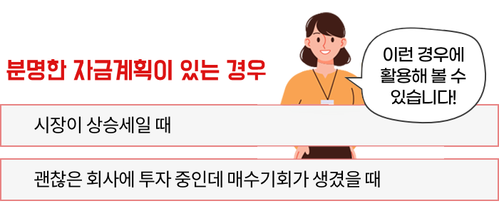 분명한 자금계획이 있는 경우(예를 들어 연말 보너스 또는 적금 만기를 앞두었을 때) 시장이 상승세일 때 이를 미리 활용한다든가, 괜찮은 회사에 투자 중인데 시장의 급변 등으로 추가 매수 기회가 생겼다고 판단될 때는 빚투를 활용할 수 있습니다.