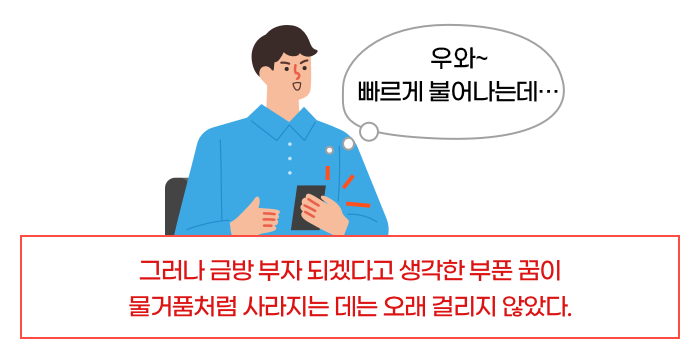 그러나 금방 부자 되겠다고 생각한 부푼 꿈이 물거품처럼 사라지는 데는 오래 걸리지 않았다.