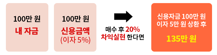 100만 원의 자금으로 100만 원의 신용금액(이자 5%로 가정)을 더해 200만 원으로 매수할 경우 20% 주가 상승으로 차익실현을 하면(신용자금 100만 원, 이자 5만 원 상환) 내 잔고는 총 135만 원이 됩니다.