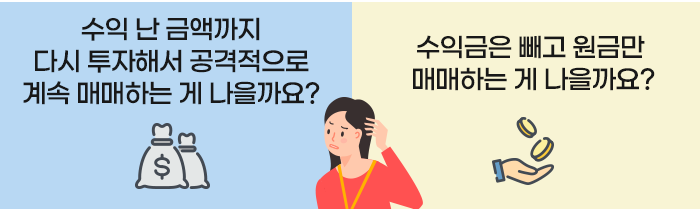 수익까지 다시 투자해서 더욱 자금을 키울까? 아니면 원금으로만 계속 매매를 해야 하는 걸까? 이러다가 한번 주가가 하락하면 그동안 수익 난 게 다 반납될 수 있는데?