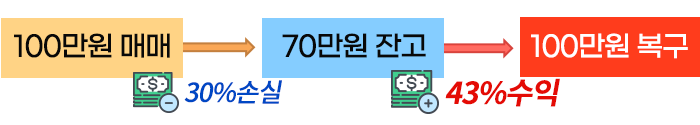또 100만 원으로 매매하다가 30% 손해를 보면 70만 원이 남는데, 70만 원으로 다시 원금 100만 원을 만들려면 30% 수익만으로는 안 되는 거 알지?