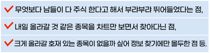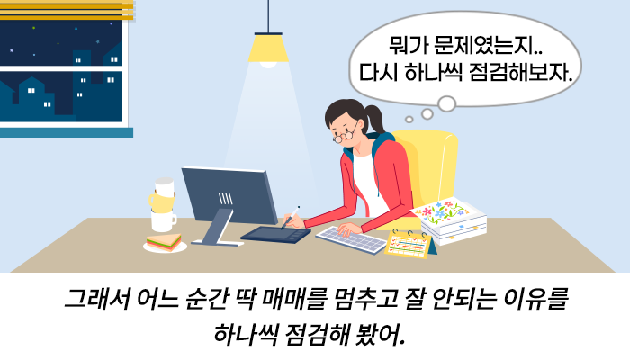 그래서 내 실패 원인을 알고 고치는 게 먼저다 싶어서 그때부터는 주식매매를 중지하고 처음부터 다시 필요한 공부를 하면서 손해 본 부분은 적금으로 채웠어. 다시 칼을 갈았던 시간이었지. 그게 지금은 많은 도움이 되었던 것 같아"