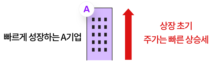 상장 초기 규모는 작지만 빠른 성장세를 보이게 되면, A 기업의 주가는 이를 반영하여 상승세를 보일 것입니다. 그렇게 시간이 지나다 보면 A 기업의 자본금도 커지고 덩치도 커지게 되며 거래되는 주수 또한 늘어나게 되겠죠.