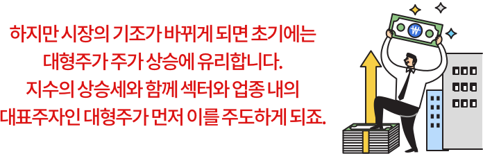 하지만 시장의 기조가 바뀌게 되면 초기에는 대형주가 주가 상승에 유리합니다. 지수의 상승세와 함께 섹터와 업종 내의 대표주자인 대형주가 먼저 이를 주도하게 되죠.
