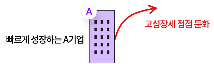 A 기업의 성장이 이어진다고 해도 상장 초기에 보여주었던 고성장세는 둔화되며, 보유한 자본대비 수익률(ROE)이 과거와 같은 수준을 보여주지 못하게 되고, 주가 또한 상장초기에 비해 변동성이 작아지게 됩니다.
