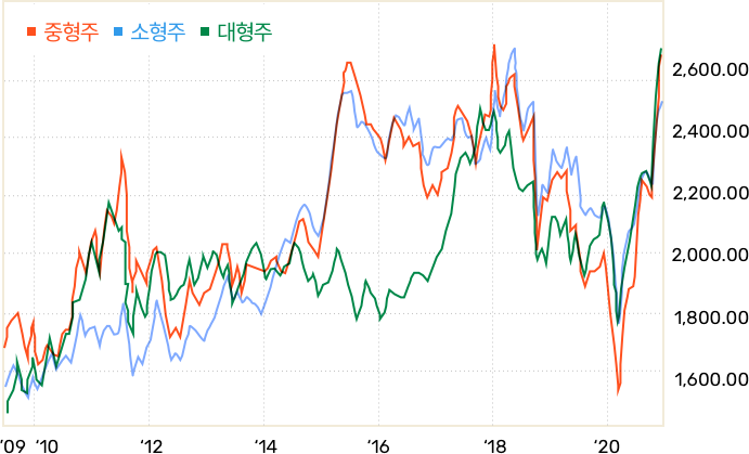 2010년 이후 코스피의 대형주와 중소형주의 움직임을 압축한 그림입니다.