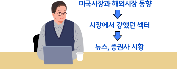 “응. 그런 다음엔 8시 30분에 이어지는 동시호가 동향도 살피고, 예상 체결이 강하거나 약한 종목이나 섹터들을 눈여겨보고. 그리고 장이 시작되면 본격적으로 시장의 움직임과 수급 동향, 아시아 시장과 환율도 봐가면서 시장의 흐름 체크하고 쏟아지는 뉴스와 종목들 계속 확인하지.”