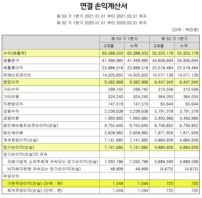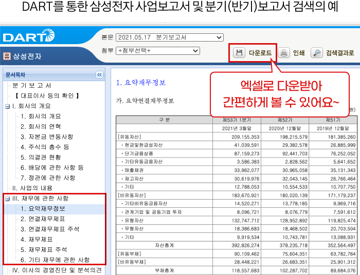 금융감독원 전자공시시스템(www.dart.fss.or.kr)을 통해 기업명과 정기공시 → 사업 보고서 및 분기(반기)를 검색하여 재무제표를 한번 살펴볼까요?