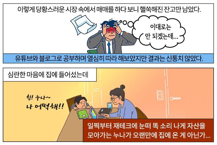 투자한다고 하는데 되레 까먹고, 1년간 열심히 아껴 모은 적금 만기금으로 시작했었는데, 그게 며칠 사이에 사라지는 걸 봤는데 일이 손에 안 잡히더라고....