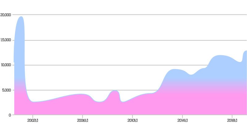 2000년 초반 18,667엔까지 급등했던 주가는 IT 거품이 소멸하자 2002년 300엔대까지 주가가 롤러코스터처럼 떨어져 버립니다.