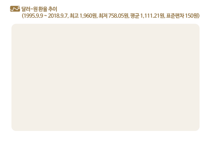 아래 그래프는 달러/원 환율의 흐름을 나타내고 있는데, 위로 크게 솟은 두 번의 흔적이 보일 것이다. 약 20년 전 우리나라의 IMF 사태와 10년 전 미국 發 금융위기 시점이다. 평소 1,000원 내외의 환율이 IMF 위기 당시 1,960원까지 상승했으며, 2008년 금융위기 당시 1,540원대까지 급등했다.