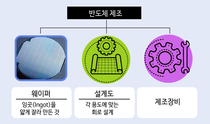 반도체를 제조하기 위해서는 웨이퍼와 설계도, 그리고 제조 장비가 필요하다. 웨이퍼는 생산 전문 업체들이 고순도 실리콘을 녹여서 만든 잉곳(Ingot)을 얇게 잘라 만든 것이다.