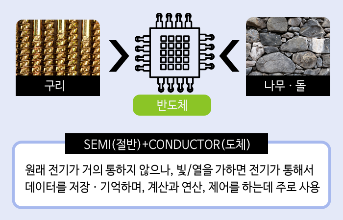 반도체는 구리처럼 전기가 잘 통하는 도체와 나무나 돌처럼 전기가 통하지 않는 부도체의 중간 성질을 가지고 있는 물질을 말한다.