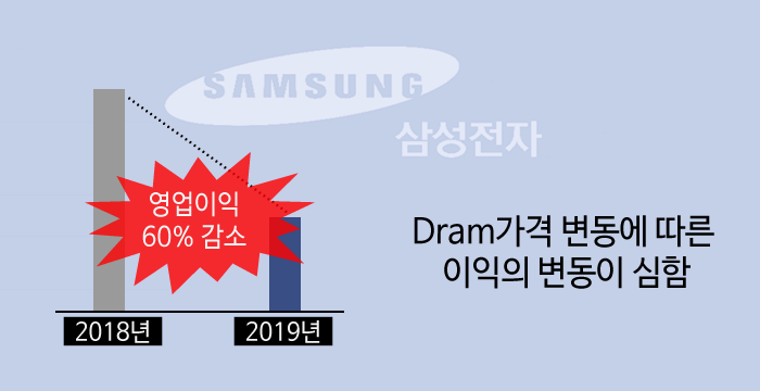 과거 우리나라 반도체 기업은 Dram 가격 변동에 따른 이익의 변동이 심했다. 삼성전자의 경우도 2018년에 비해 2019년도에는 이익이 60%나 줄어들 정도다.