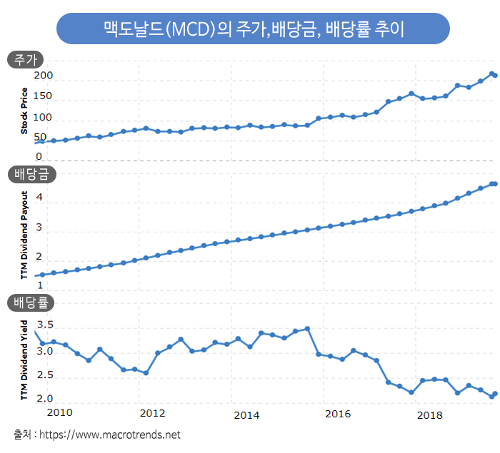 위 자료는 최근 10년간의 맥도날드 주가흐름, 배당금, 배당률 추이를 보여 준다. 금융위기와 각종 경기의 흐름과 무관하게 배당금을 꾸준히 늘려왔으며 주가 또한 큰 변동없이 우상향했음을 알 수 있다. 많은 혁신 기업들이 생기고 없어지지만 이런 필수소비재적 성향을 가진 기업은 상대적으로 안정적으로 우상향하며 오히려 장기투자자들에게 큰 보상을 줄 수 있다는 점 또한 매력적이다.