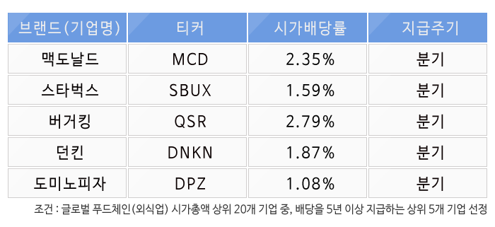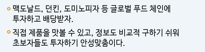 맥도날드, 스타벅스, 버거킹, 던킨, 도미노피자 등 너무나 익숙해서 투자대상으로조차 생각하지 못하는 사람들이 많다. 미국 기업들이지만 우리나라를 포함한 전세계에 퍼져 입맛을 사로잡은 글로벌 푸드 체인에 투자하여 배당금까지 덤으로 받아보자.